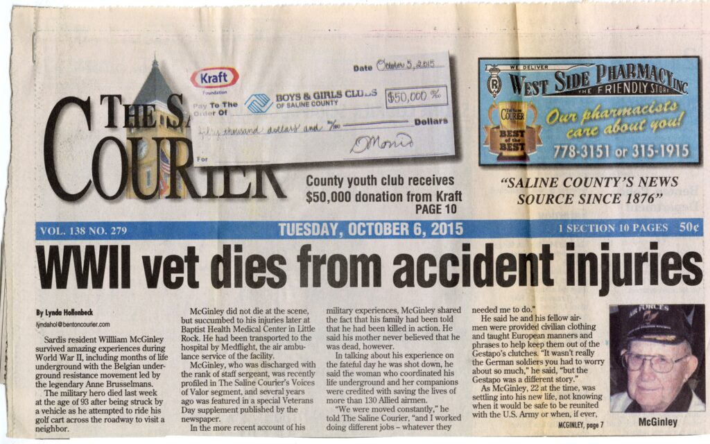 McGinley’s heroic life ended in October 2015 when he was 93 years old. McGinley died after being struck by a vehicle while riding his golf cart across the street to visit his neighbor. McGinley succumbed to his injuries at Baptist Health Medical Center in Little Rock after he was flown there by Medflight.9 At the Gann Museum, we don’t have any of McGinley’s things in our current WWII display, but his name is on our Wall of Honor in the front room. I want to thank Peggy Tull Roberson for donating her clippings about the legendary Bill McGinley.
