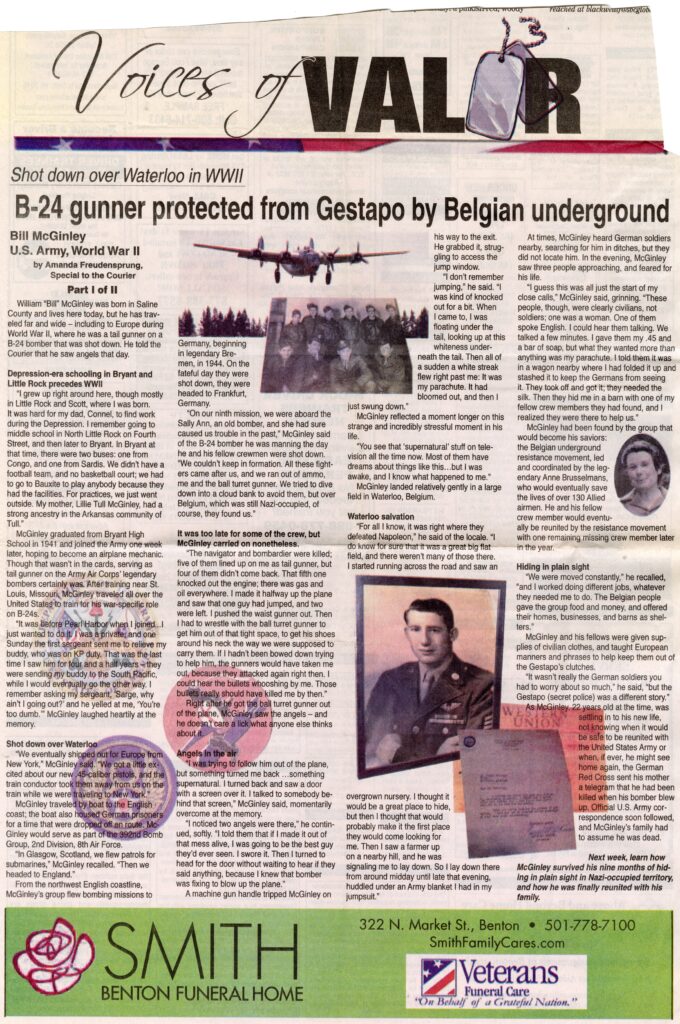 8 Amanda Freudensprung, “Bill McGinley U.S. Army, World War II – Part I of II,” Saline Courier, Date Unknown. Newspaper clipping. Arnold Wright, My Country Called, 1993, p. 194-195.