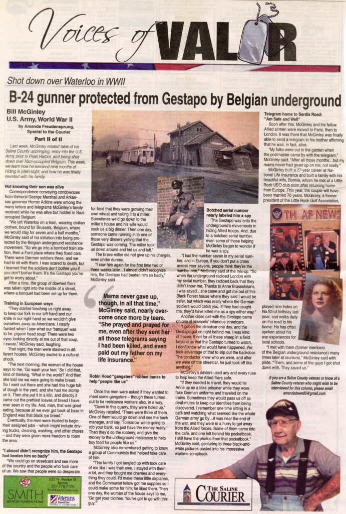 4 Arnold Wright, My Country Called, 1993, p. 194-195. Amanda Freudensprung, “Bill McGinley U.S. Army, World War II – Part I of II,” Saline Courier, Date Unknown. Newspaper clipping.